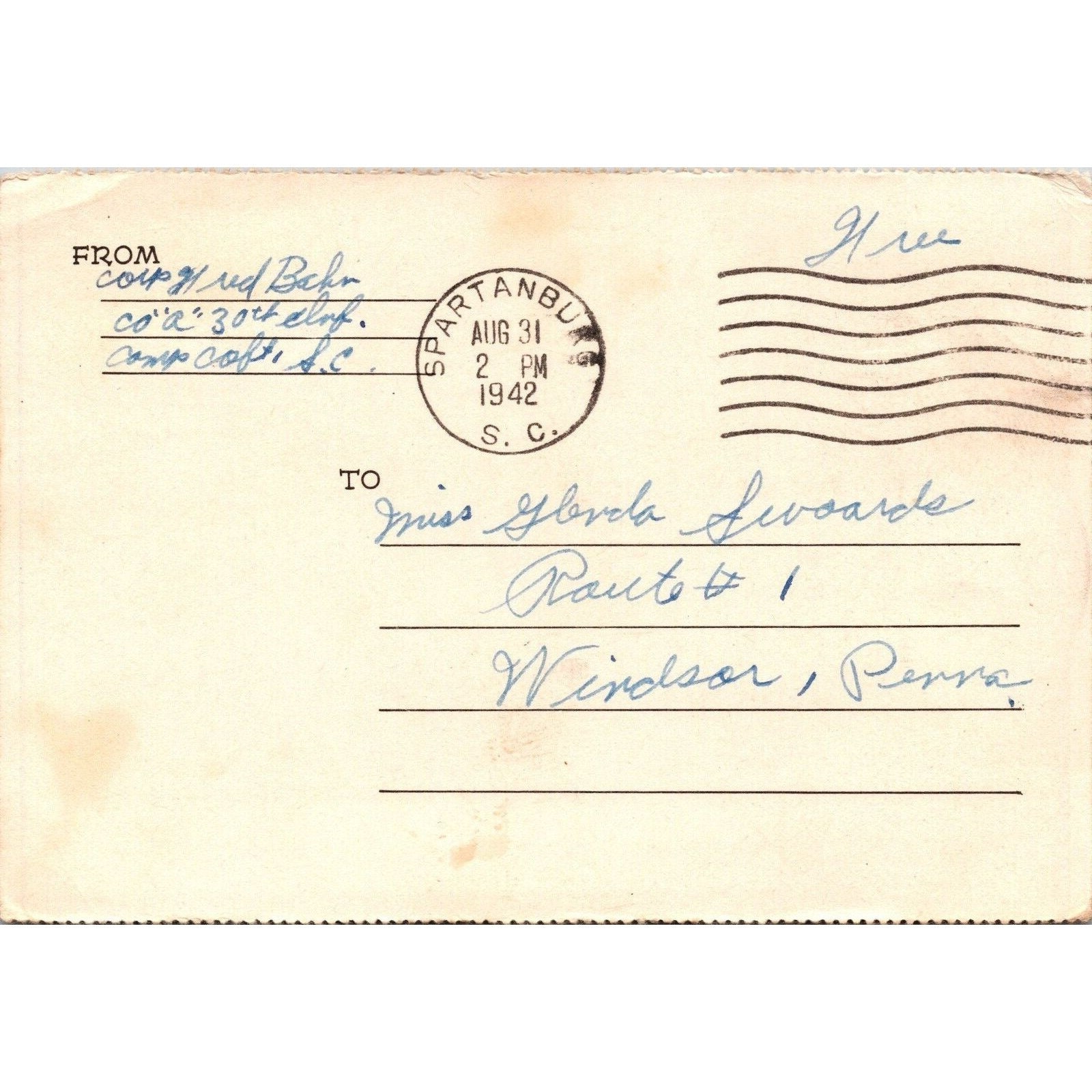 Here we have a Vintage A Little Behind On My Mail Baby In Uniform Postcard. It was made by Wipco 1942. It is in good condition. It has wear around the edges. It has been circulated. The postmark date says Aug 31, 1942. It is written on.