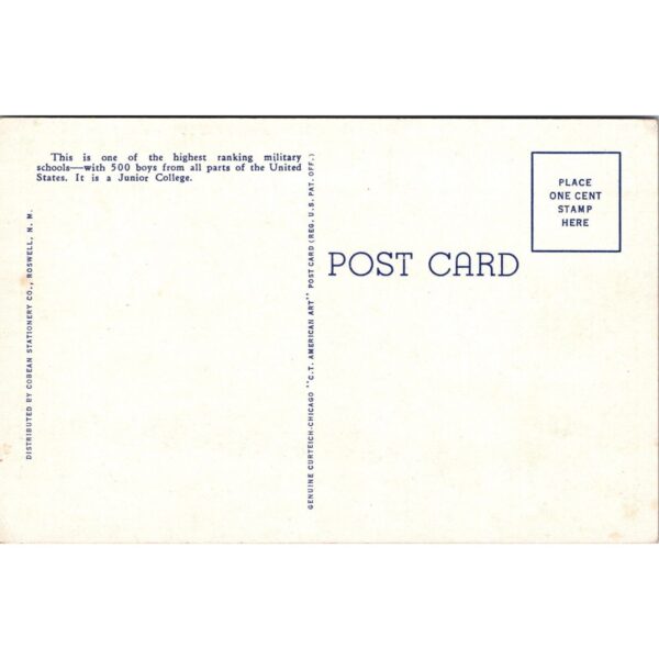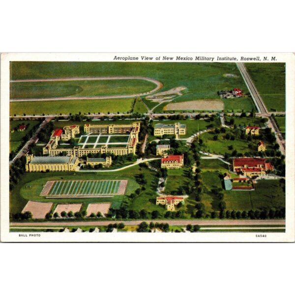 Here we have a Vintage Aerial View Of New Mexico Military Institute Roswell New Mexico Postcard. The back says Distributed By Cobean Stationery Co. The back says Genuine Curteich Chicago C.T. American Art.