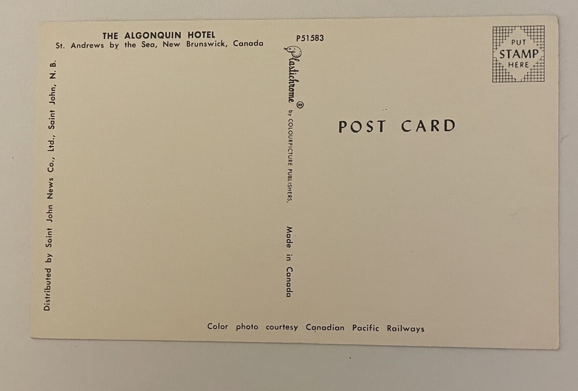 Algonquin Hotel St. Andrews By The Sea New Brunswick Canada Postcard. The back