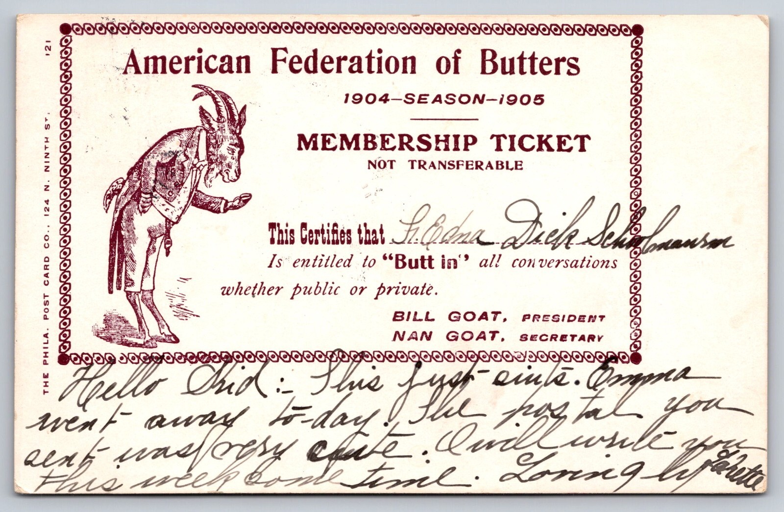 American Federation Of Butters Membership Ticket Goat Man Postcard