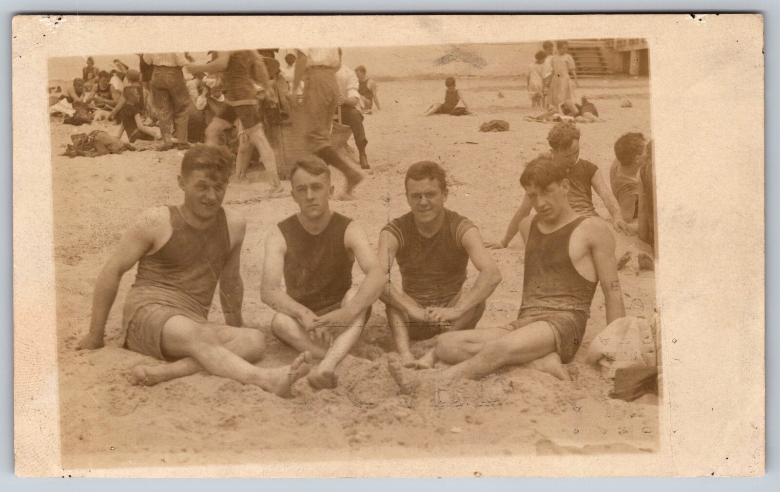 Beach Scene Men Sitting On The beach Wearing Old Bathing Suits Postcard RPPC. It is