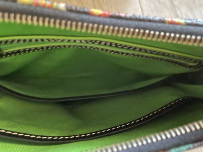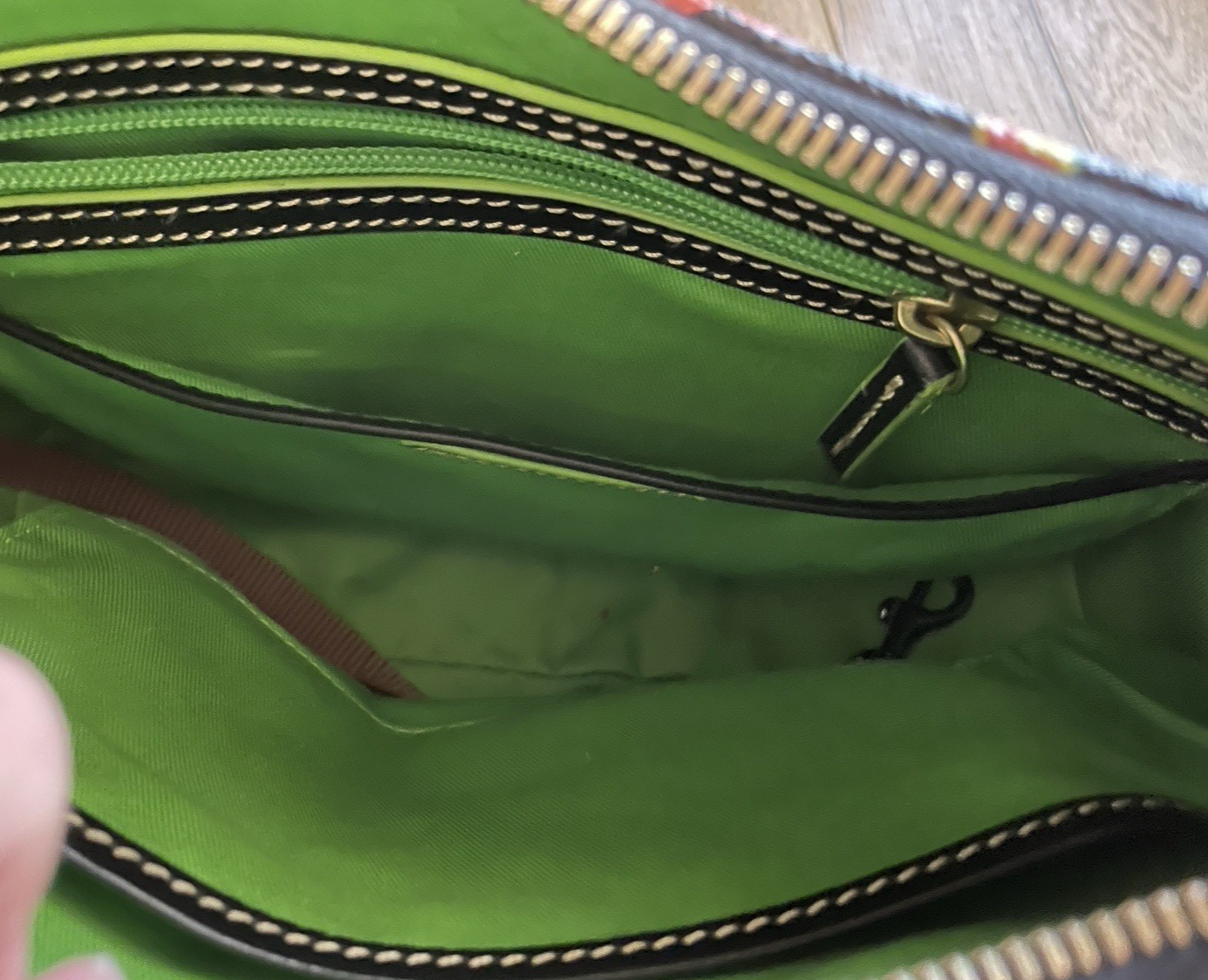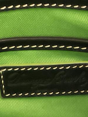 Dooney & Bourke . It is approx 10 wide x approx 8 1/2″ high. With the handle