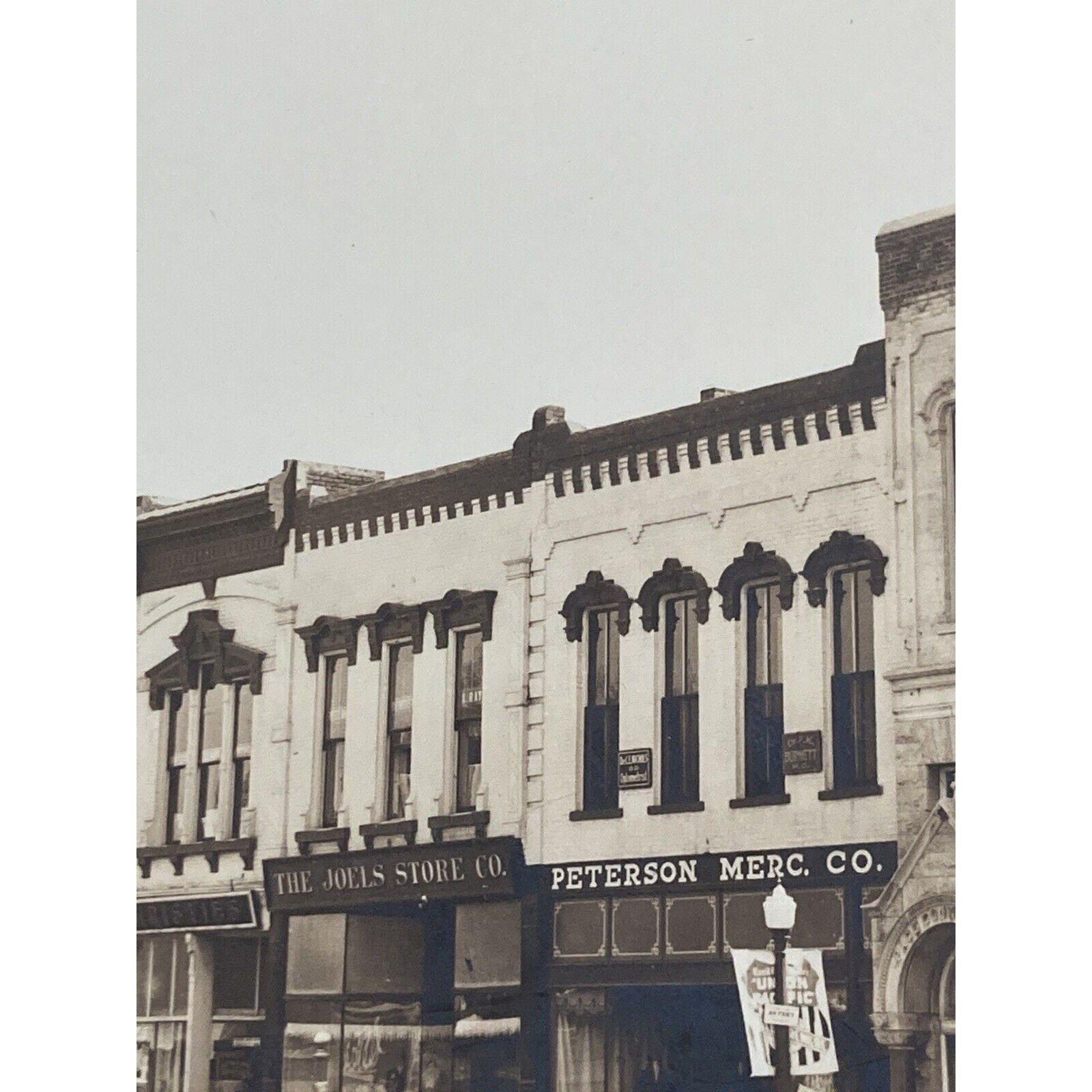 Here we have a Vintage Gamble Stores, Peterson Merc Co & The Joels Store Vintage Cars RPPC Postcard. Light Electric Power & a Bank. Union Pacific Signs. The back says The L.L. Cook Co. It is in good condition. It does have some wear and imperfections. It is uncirculated. See photos for more info.