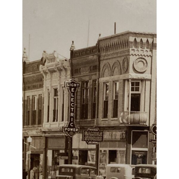 Here we have a Vintage Gamble Stores, Peterson Merc Co & The Joels Store Vintage Cars RPPC Postcard. Light Electric Power & a Bank. Union Pacific Signs. The back says The L.L. Cook Co. It is in good condition. It does have some wear and imperfections. It is uncirculated. See photos for more …