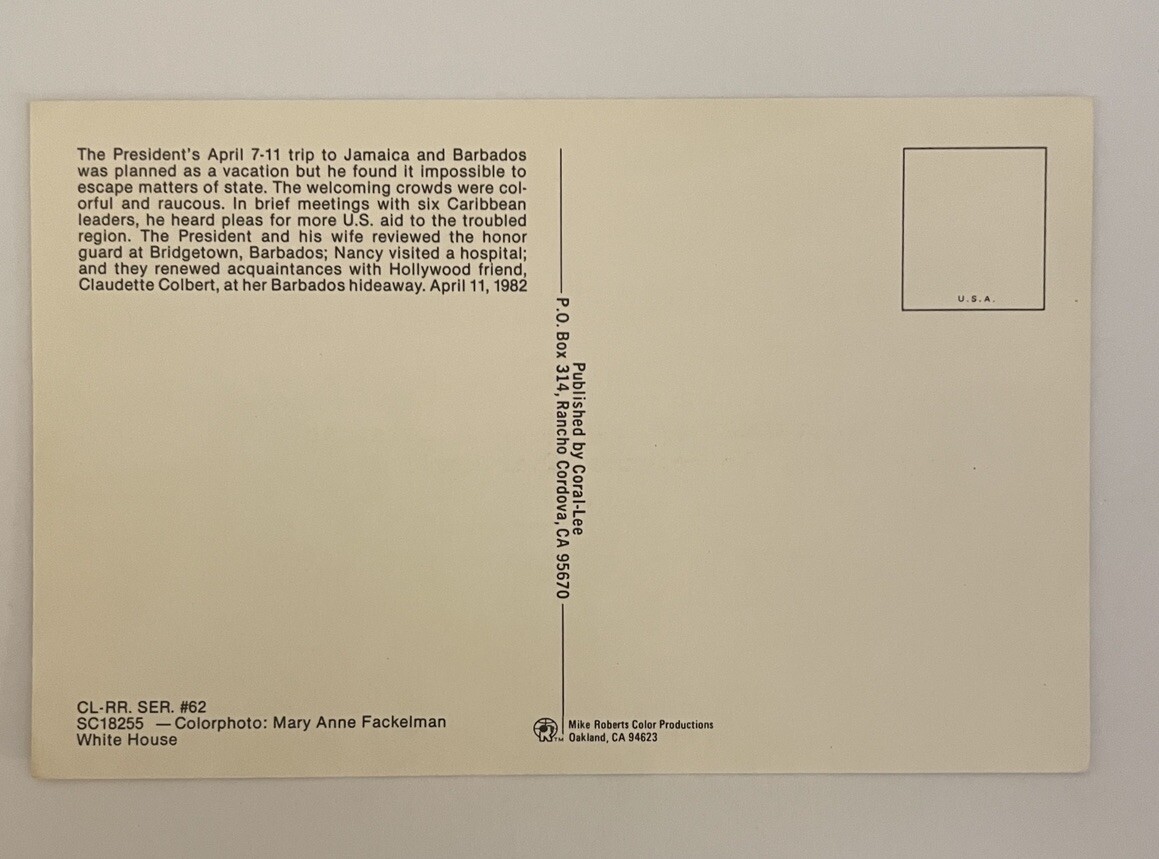 Reagan Postcard. The back says published by Coral-Lee. It in good condition. It has wear