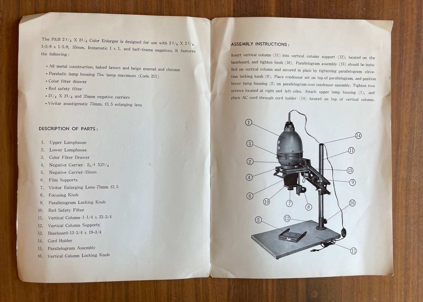P & B 2 1/4 x 2 1/4 Enlarger Assembly Instructions Booklet
