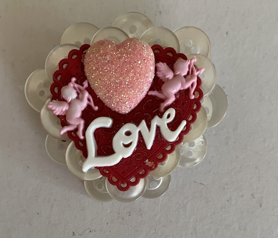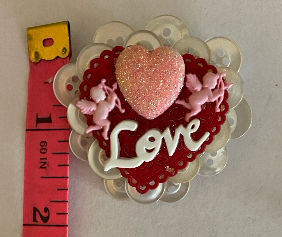 Here we have a Valentines Day Cupid Red Love Heart Pin Brooch. It is handmade. It is approx 1 1/2″. It is brand new without packaging. See photos for