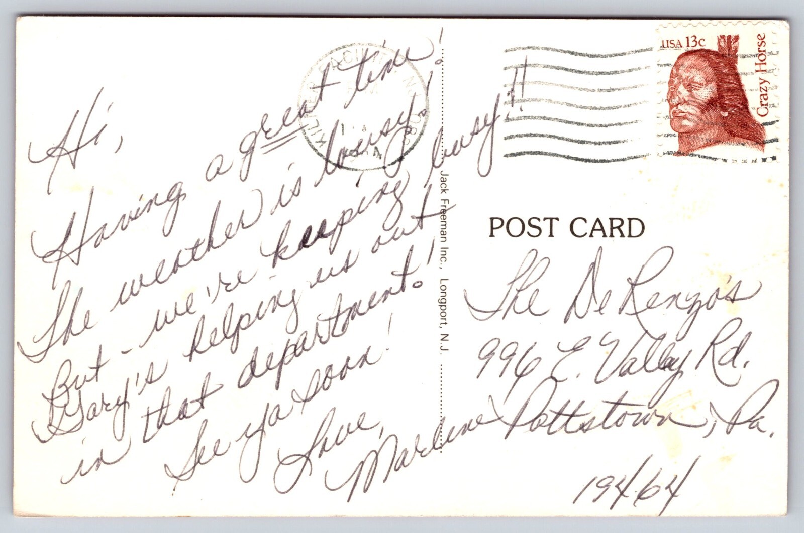 postmark date unreadable. It has a 13 cent stamp with Native American Crazy